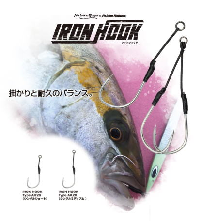 近海のヒラマサ、ブリへ照準を絞り、細部のパーツ、長さを絶妙なバランスにてセッティング。刺さりの良さと耐久性のバランスを徹底追及。現代の近海ジギングに細軸フックの存在は必要不可欠。しかし、掛かりのスピードが向上するとともに、身切れによるバレのリスクも高くなる。アベレージサイズの青物はもちろん、ある程度のゲイブの広さで深くフッキングが可能で不意の10kgOVERにも対応できるフックが必要と考えた。そしてこの針に辿り着いた。